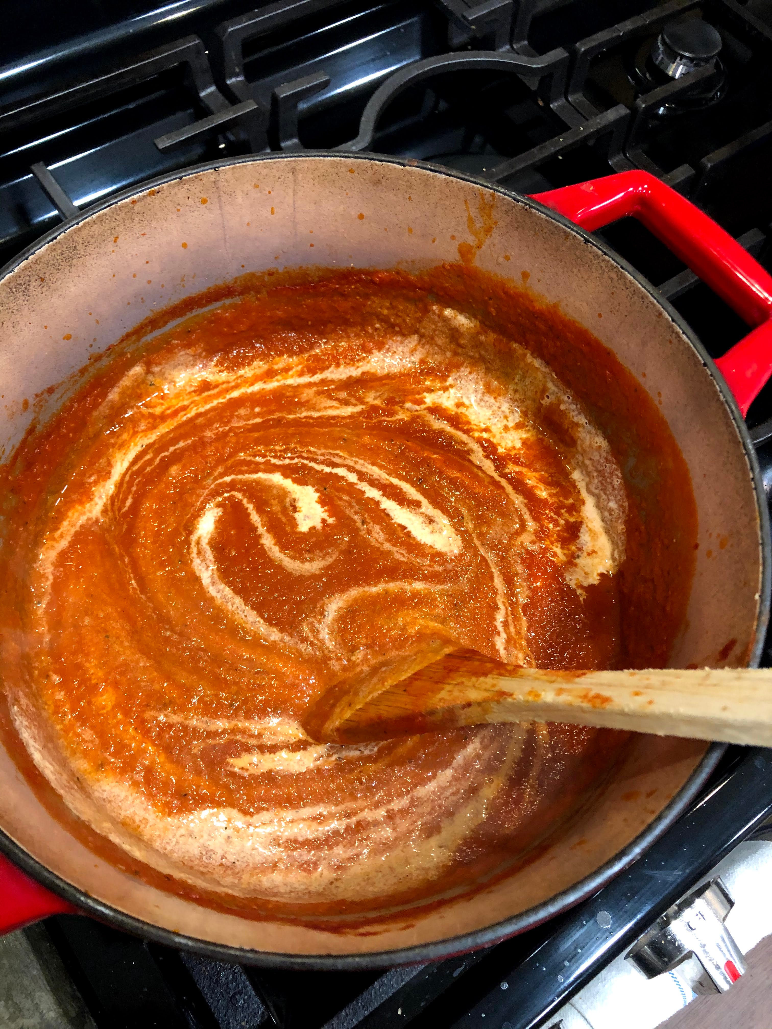 Back to the sauce- Add basil to it. Bust out your immersion blender, turn off the heat, and blend the sauce right in the pot. Be careful! Then add the cream, vodka, cheese, and another pinch of salt. Turn the heat back on to low, and simmer the sauce for the remaining time it takes for the pasta to cook. Right before the pasta is finished, pour out half of the sauce to save for a later date. *If you’re using a full box of pasta then you may not need to pour any sauce off.